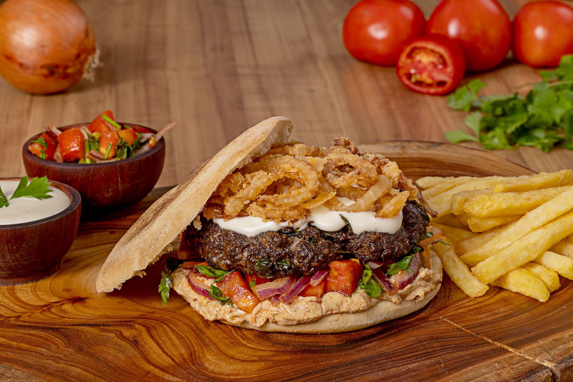 No cardápio, o lanche promete salada mediterrânea, mas, na prática, veio com cebola roxa, um pouco de cebola crispy, molho árabe na base do pão e, por cima, habesh (molho de alho). Mesmo com poucos ingredientes, o conjunto funciona: é uma combinação intensa, direta e cheia de sabor. Acompanha ainda uma pequena porção de fritas.