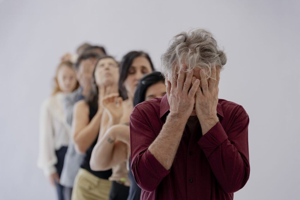 E do vértice, da agitação, do movimento (Um) Ensaio sobre a cegueira (que fica em cartaz até o dia 14/12), do Grupo Galpão, leva essa tônica ao seu máximo, caracterizando o evento do ano. O anúncio do grupo em São Paulo é sempre algo disputadíssimo e que, para aqueles que conhecem o trabalho deles, já produz uma expectativa. Dessa vez, contando com a direção fabulosa de Rodrigo Portella, foram para o clássico literário de José Saramago, algo que, a primeira vista, pode parecer distante do aspecto marcante no grupo que é a sua aura circense, que, entretanto, se torna o grande ganho: o quanto a solidez dos artistas, a naturalidade que dão para as cenas, e a forma de envolver o público faz o espetáculo ganhar um contorno todo próprio. O teatro pulsante do grupo só se dá pela naturalidade que eles conseguem inserir em cena a própria plateia, que vai se tornando personagens e vítimas da cegueira branca, contada na história. De forma extremamente orgânica o público integra o espetáculo e, se em Vinte! o palco se torna pequeno, aqui o Grupo Galpão vai demonstrando ao longo de toda a peça que todo espaço é espaço cênico, inclusive com os artistas saindo em cena (só essa cena já daria ensejo para um texto próprio, a forma como a saída de cena, o silêncio e a tensão, se constroem é duma assertividade que engole o público).