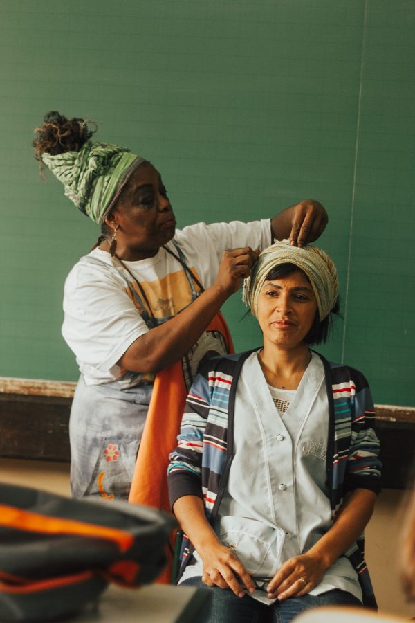 atriz e griô Geisa Costa, na contação de história. Com sua boneca Dandara, falava da importância das histórias contadas por nossos antepassados. E enquanto falava de suas avós colocava um turbante na professora.