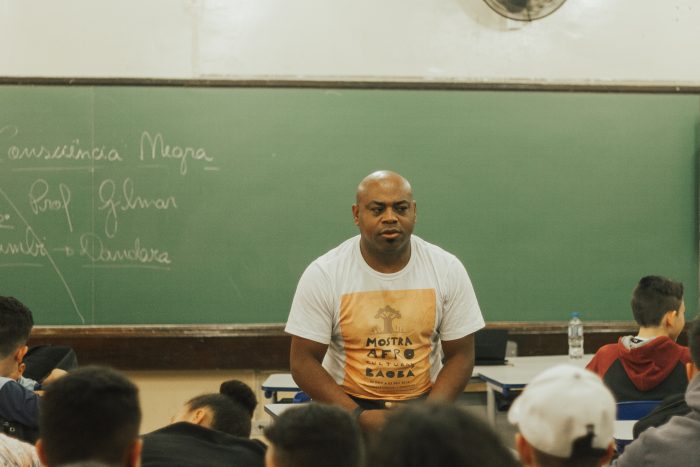 produtor do projeto, Gilmar Rodrigues de Lima, contando a história dos quase 400 anos de escravidão no Brasil, da luta de resistência de Zumbi e Dandara dos Palmares, sobre a desigualdade social e o racismo.
