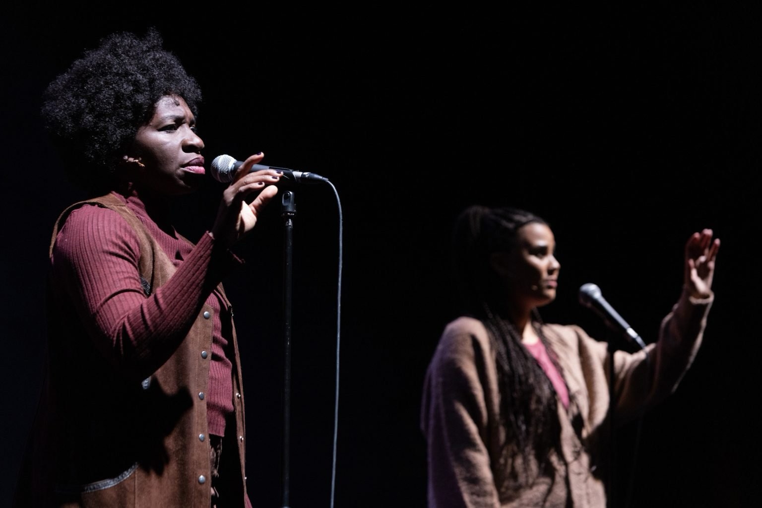 São duas mulheres em cena, entretanto, elas se tornam várias ao longo do espetáculo. É nesse virar vários que a opção de um levante nos mobiliza e nos convida.