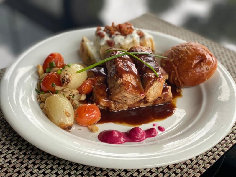 Uma opção com toque internacional é o Lombo ao barbecue (R$ 34). Traz um suculento lombo suíno ao molho barbecue, com batata assada com creme de ciboulette e bacon, confit de champignon, cebola, tomate e pão brioche. Para acompanhar, salada de alface, rúcula e morango.