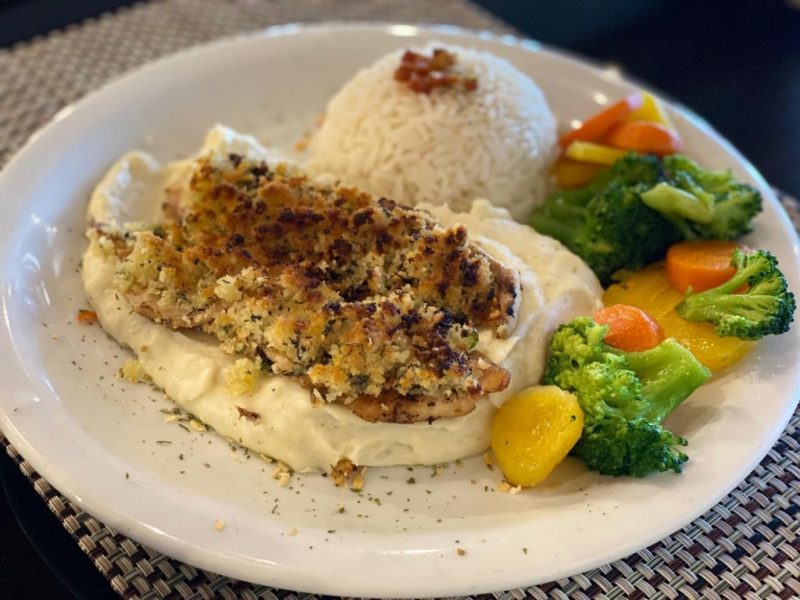Um prato bem leve é o Peixe em crosta de ervas. Traz filé de tilápia com arroz, legumes na manteiga, cenoura, brócolis, batata salsa e purê com toque de limão siciliano. Vem guarnecido pela salada Coleslau (repolho branco e roxo, cenoura e uva passa). Sai por R$ 31.
