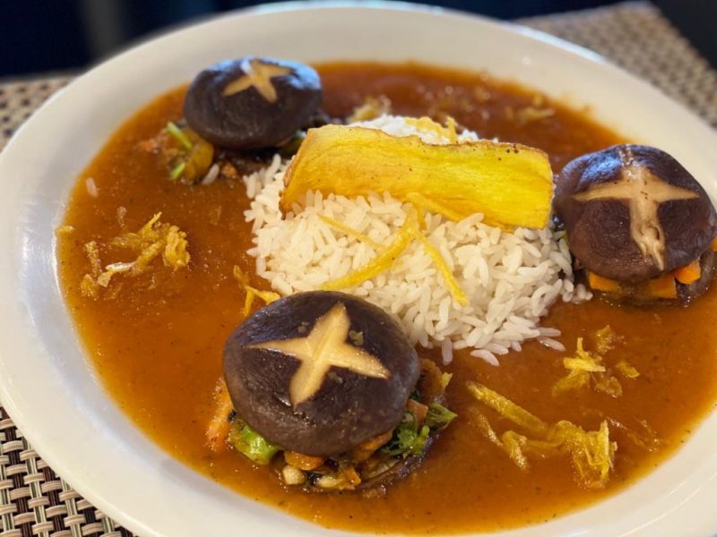 Para quem não come carnes, a escolha certeira é o Prato vegetariano. Vem com shitake e legumes na manteiga, mais arroz, molho ao sugo e crispy de batata salsa. Custa R$ 21.